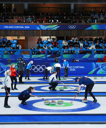 〔写真説明〕開会式に先立ち競技が始まったカーリングの混合ダブルス1次リーグ=4日、コルティナダンペッツォ