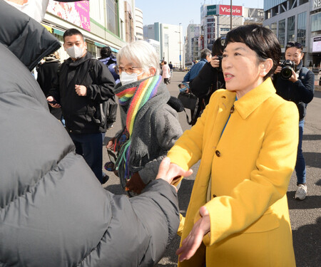〔写真説明〕有権者と握手する社民党の福島瑞穂党首(右)=1月27日、東京・JR新宿駅前