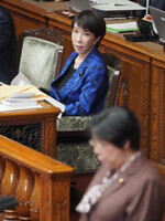〔写真説明〕参院本会議で立憲民主党の田名部匡代幹事長(手前)の代表質問を聞く高市早苗首相=25日午前、国会内