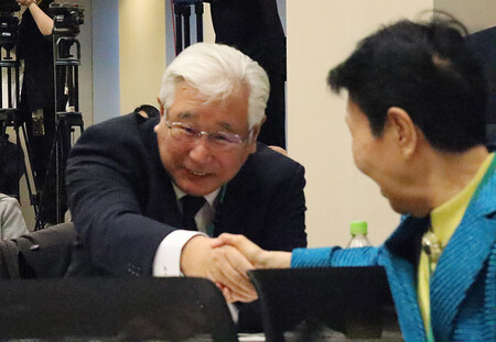 〔写真説明〕「日野町事件」の再審開始が確定し、冤罪(えんざい)被害者家族の袴田ひで子さん(右)と握手する阪原弘さんの長男弘次さん=25日午前、東京都千代田区