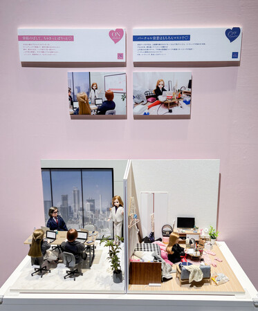 4日に東京・新宿でスタートした「リカちゃんのON/OFF展」の会場には、オフィススタイルの服のほか、部屋着姿のリカちゃんも展示。「理想の自分でいる時間」と「現実の自分でいる時間」の「どちらも大切な自分の一部であること」をメッセージに込めたという。