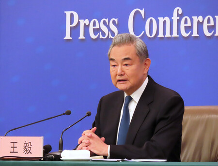 〔写真説明〕8日、北京で記者会見に臨む中国の王毅共産党政治局員兼外相
