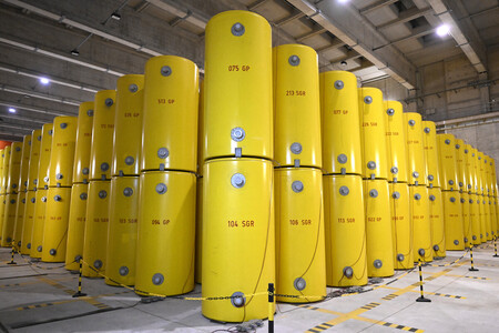 〔写真説明〕原発から出た高レベル放射性廃棄物の容器が並ぶ中間貯蔵施設=2025年9月18日、ドイツ西部アーハウス(AFP時事)