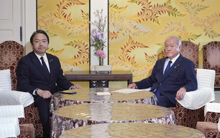 〔写真説明〕会談に臨む自民党の鈴木俊一幹事長(右)、国民民主党の榛葉賀津也幹事長=10日午後、国会内