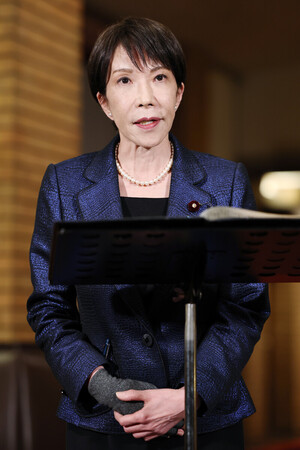 〔写真説明〕石油備蓄の放出などに関し、記者団の取材に応じる高市早苗首相=11日午後、首相公邸