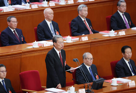 〔写真説明〕12日、北京で開催された全国人民代表大会の閉幕式で演説する趙楽際・全人代常務委員長(前列右から3人目)(EPA時事)