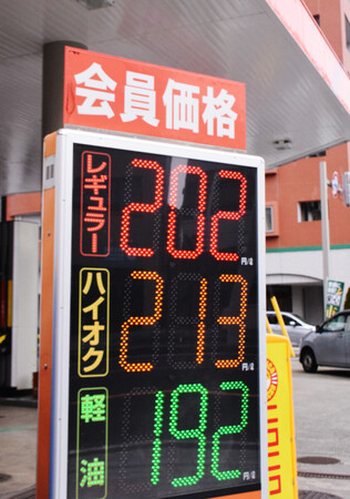 〔写真説明〕レギュラー価格202円を示すガソリンスタンドの価格看板=18日午後、山形市