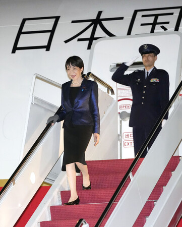 〔写真説明〕日米首脳会談のため、ワシントン郊外のアンドルーズ空軍基地に到着した高市早苗首相=18日午後(代表撮影・時事)