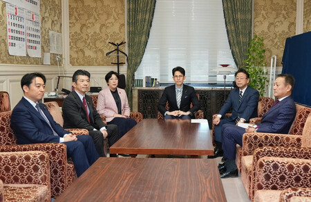 〔写真説明〕会談に臨む中道改革連合の階猛幹事長(左から4人目)、立憲民主党の田名部匡代幹事長(同3人目)、公明党の西田実仁幹事長(同5人目)ら=24日午前、国会内
