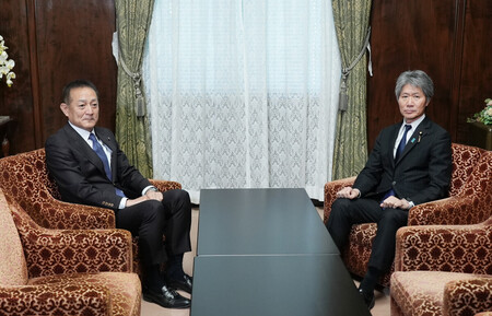 〔写真説明〕会談に臨む自民党の磯崎仁彦参院国対委員長(右)と立憲民主党の斎藤嘉隆国対委員長=6日午前、国会内