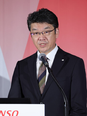 〔写真説明〕経営計画について説明する自動車部品大手デンソーの林新之助社長=3月31日、東京都中央区