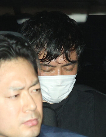 〔写真説明〕死体遺棄容疑で逮捕され、警視庁麻布署に入る水口克也容疑者(右)=17日午後、東京都港区