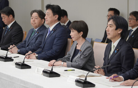 〔写真説明〕月例経済報告関係閣僚会議に臨む高市早苗首相(右から2人目)=23日午後、首相官邸