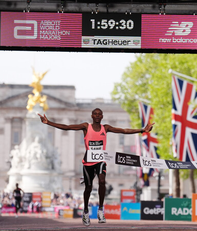 【ロンドン時事】ロンドン・マラソンは26日、ロンドン市街地コースで行われ、男子はセバスティアンキマル・サウェ(ケニア)が1時間59分30秒で2連覇した。2時間を切るのは史上初。従来の記録は2023年10月のシカゴ・マラソンでケルビン・キプトゥム(同)がマークした2時間0分35秒で、1分以上も更新した。2位のヨミフ・ケジェルチャ(エチオピア)も1時間59分41秒の好記録だった。