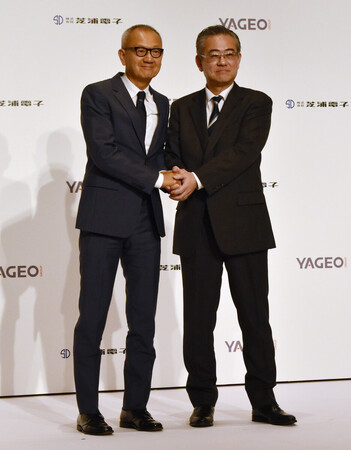 〔写真説明〕記者会見で握手するヤゲオのピエール・チェン会長(左)と芝浦電子の葛西晃社長=21日午後、東京都千代田区