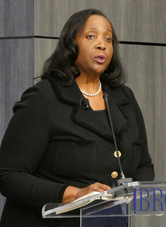 〔写真説明〕講演する米連邦準備制度理事会(FRB)のクック理事=3日、ワシントン