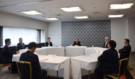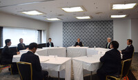 〔写真説明〕柏崎刈羽原発から30キロ圏内にある自治体の首長との意見交換会に臨む新潟県の花角英世知事(奥中央)ら=14日午後、新潟県長岡市