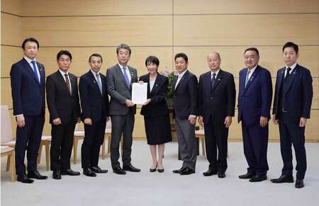 〔写真説明〕「責任ある積極財政を推進する議員連盟」の中村裕之共同代表(左から4人目)から提言書を受け取る高市早苗首相(中央)=18日午後、首相官邸