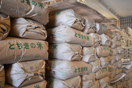 〔写真説明〕低温倉庫に積み上げられた2025年産米=10月23日、栃木県大田原市