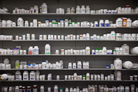 〔写真説明〕薬局の棚に並ぶ処方薬=5月12日、米カリフォルニア州ロサンゼルス(EPA時事)