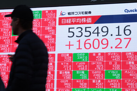 〔写真説明〕最高値を更新した日経平均株価の終値5万3549円を示すモニター=13日午後、東京都中央区