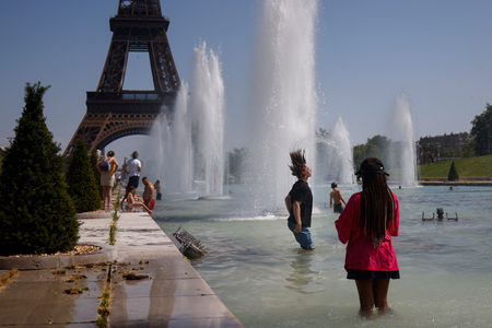 〔写真説明〕熱波の中、噴水の水で涼む人たち=2025年7月、フランス・パリ(EPA時事)