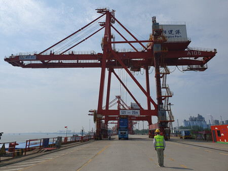 〔写真説明〕中国・武漢港のコンテナ積み下ろし作業=2025年5月