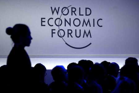 〔写真説明〕2025年1月にダボスで撮影された世界経済フォーラム(WEF)のロゴ(AFP時事)