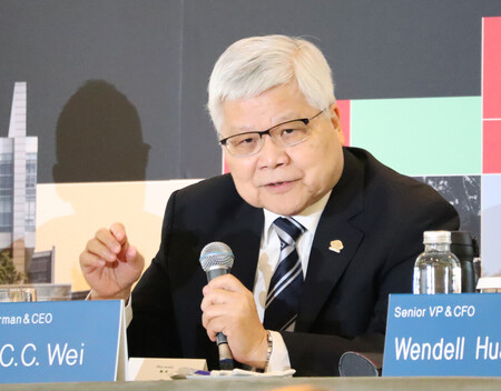 〔写真説明〕15日、台北で開かれた台湾積体電路製造(TSMC)の決算説明会で発言する魏哲家会長兼最高経営責任者(CEO)