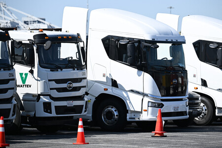 〔写真説明〕中国自動車大手「比亜迪(BYD)」の電気自動車(EV)トラック=2025年4月、米カリフォルニア州ロングビーチ(AFP時事)