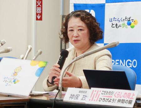 〔写真説明〕記者会見する連合の芳野友子会長=19日午後、東京都千代田区