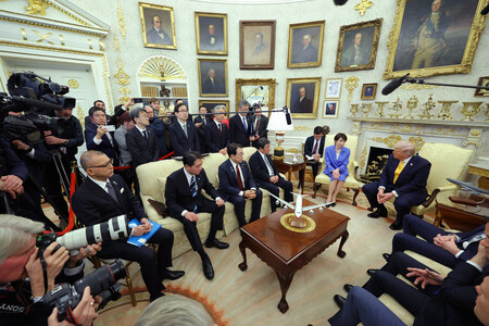 【ワシントン時事】トランプ米大統領は19日、ホワイトハウスで高市早苗首相と会談した際、記者団との質疑応答で、連邦準備制度理事会(FRB)のパウエル議長に対し「すぐに利下げすべきだ」と、改めて要求した。利下げしないのは「頑固で無能な人物だからだ」とこき下ろした。 〔写真説明〕米ホワイトハウスで会談する高市早苗首相(右から2人目)とトランプ大統領(右端)=19日、ワシントン