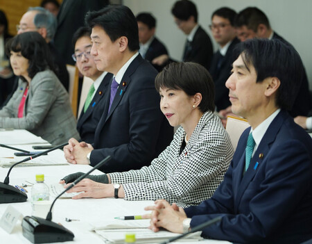 〔写真説明〕政労使会議で発言する高市早苗首相(右から2人目)=23日午後、首相官邸