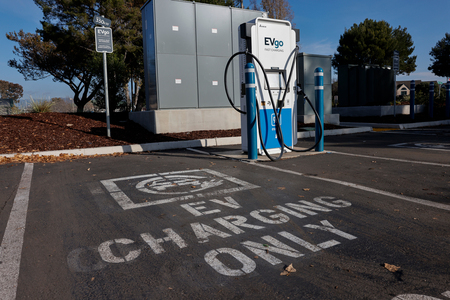 〔写真説明〕米カリフォルニア州アラメダに設置されている急速充電ステーション=2025年12月(EPA時事)