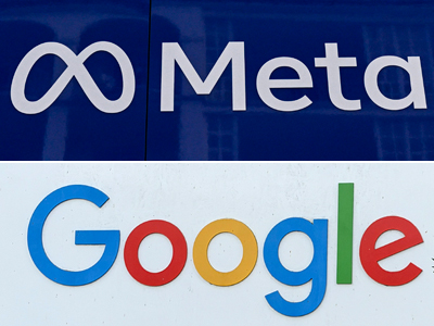 〔写真説明〕米メタ(写真上、AFP時事)とグーグルのロゴマーク(EPA時事)
