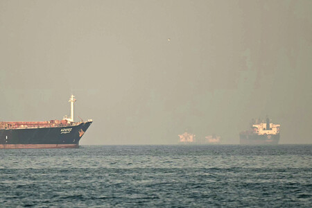〔写真説明〕ホルムズ海峡を通過する貨物船やタンカー=2月25日、アラブ首長国連邦(UAE)東部フジャイラ沖(AFP時事)