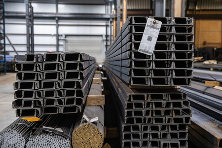 〔写真説明〕米マサチューセッツ州マールボロにある会社の床に並べられた鋼材=2025年3月(AFP時事)