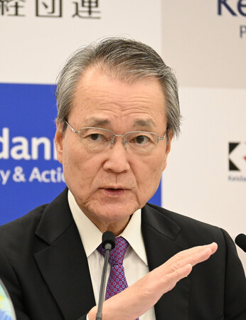 〔写真説明〕記者会見する経団連の筒井義信会長=6日午後、東京都千代田区