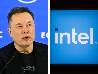 〔写真説明〕米実業家イーロン・マスク氏(写真左)とインテルのロゴマーク(いずれもAFP時事)