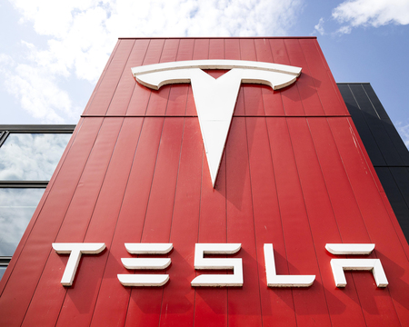 〔写真説明〕米電気自動車(EV)大手テスラのロゴ(オランダ・アムステルダム)(EPA時事)