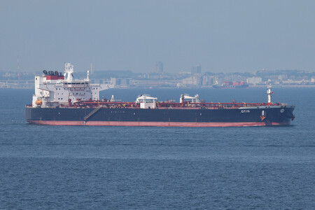 〔写真説明〕米国産の原油を積み、東京湾を航行するタンカー=26日午前、千葉県木更津市から撮影