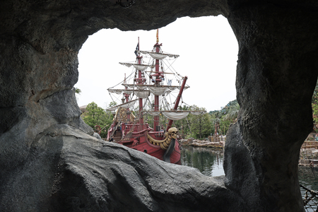 〔写真説明〕「ファンタジースプリングス」の「ピーター・パン」エリアに浮かぶ海賊船=2024年6月、千葉県浦安市の東京ディズニーシー