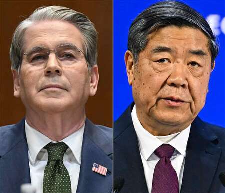〔写真説明〕写真左からベセント米財務長官と何立峰中国副首相(AFP時事)
