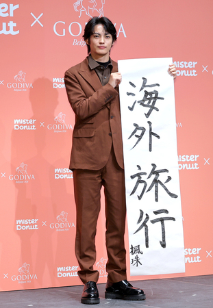 Donut×GODIVA」新商品発表会に出席し、書き初めで記した「2026年にやりたいこと」を披露する神尾楓珠=5日、東京