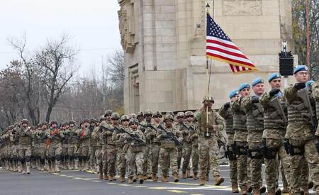 〔写真説明〕1日、ルーマニアの首都ブカレストで行進する米兵(EPA時事)