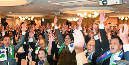 〔写真説明〕高市早苗氏が自民党新総裁に選出され、万歳する支援者ら=4日午後、奈良県天理市