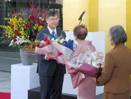 〔写真説明〕出身地の滋賀県長浜市で行われたノーベル生理学・医学賞受賞の祝賀会で、花束を受け取る大阪大の坂口志文特任教授(左)=7日午後