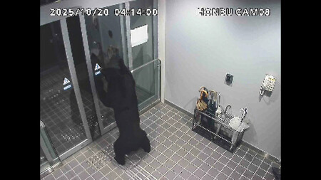 〔写真説明〕消防本部に侵入し、玄関から出ようとするクマ=10月20日、秋田県湯沢市(湯沢雄勝広域市町村圏組合消防本部提供)