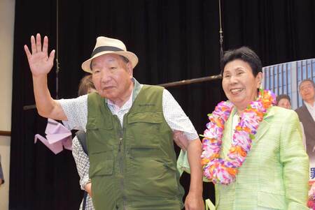 〔写真説明〕再審での無罪判決確定を祝う支援者集会で、支援者の声援に応える袴田巌さん(左)と姉のひで子さん=2024年10月14日、静岡市内