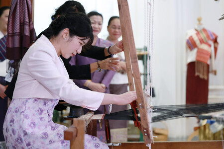 〔写真説明〕ラオ・シルク・レジデンスを視察し、機織りを体験される天皇、皇后両陛下の長女愛子さま=21日、ビエンチャン